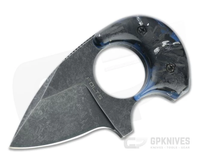 The elusive Baby Bear from Alan Folts is back and as good as ever. This ultra-compact ring knife makes a perfect every day carry fixed blade and excels in both utility and defensive tasks. This version comes with a “blackwash” finished CPM-154 blade, Kipps Custom Flake Blue Glow Carbon Acrylic scales, and custom leather belt sheath.