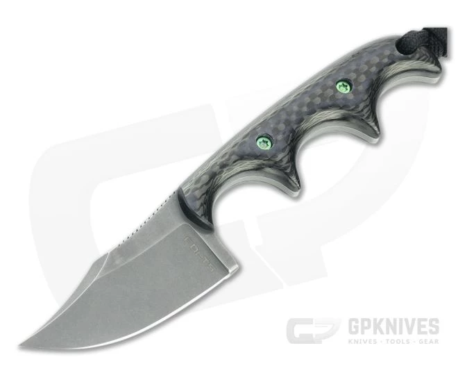 Alan Folts Custom Minimalist is a small everyday carry fixed blade made for maximum function with minimal size. The lightweight, well-balanced design has a small footprint, making it a perfect choice for discreet everyday carry. This version comes with carbon fiber scales, green anodized titanium hardware and a tumbled CPM-154 Bowie blade.