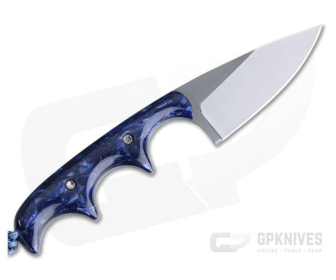 Alan Folts Custom Minimalist Drop Point is a small everyday carry fixed blade made to be minimal in size (hence the name) while offering maximum function. The lightweight, well-balanced design doesn’t take up much space making it a perfect choice for discreet every day carry. This version comes with smooth, Blue Pearl Kirinite acrylic handles and a polished two-tone CPM-154 blade.