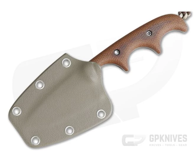 Handle:Â Three deep finger grooves and attached lanyard create a secure and ergonomic grip. The addition of the lanyard extends the 3-finger grip to fill most hands. Matte finished natural Micarta handle scales are attached via Torx screw hardware.