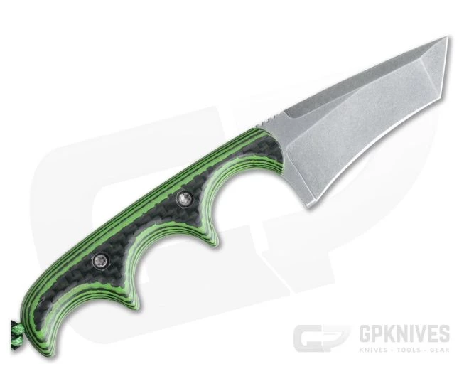 Handle:Â Three deep finger grooves and attached lanyard create a secure and ergonomic grip. The addition of the lanyard extends the 3-finger grip to fill most hands. Polished and contoured Carbon Fiber/Green G10 Hybrid handle scales are attached via Torx screw hardware over green liners and provide a secure, high traction grip rounding out the stunning aesthetic of this piece.