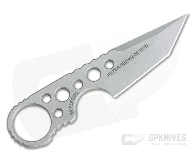 Ultra compact and light weight the Skelergo Backup designed by Peter Fegan designed offers a compact design for discreet carry with a full size Tanto blade and full tang, skeletonized construction with ring end for speed and security. Construction is skeletonized 440C stainless steel with a stonewashed finish.