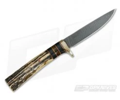 Blade:Â Taking inspiration from the Bird & Trout knife form this custom neck knife has a long, slim blade that is nimble and capable. The blade is a carbon Damascus with a Tight Twist pattern that is eye-catching with a full flat grind for excellent performance. The carbon Damascus is tough and takes a razor sharp edge for easy maintenance in the field.