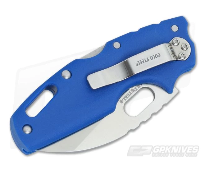 Handle:Â Cold Steel’s Griv-Ex material is an extremely tough nylon formula engineered with an enormous strength to weight ratio. This one is Blue in color and has hollowed out grooves along with light texturing for traction. Dual choils toward the blade allow the user to cut confidently with the knife locked in the hand with a secure and comfortable fit for the majority of users. A mid-back Tri-Ad lock is simple to operate while delivering optimal strength and security over the life of the knife. A slot is provided for lanyard attachment.