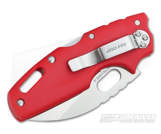 Handle:Â Cold Steel’s Griv-Ex material is an extremely tough nylon formula engineered with an enormous strength to weight ratio. This one is Red and has hollowed out grooves along with light texturing for traction. Dual choils toward the blade allow the user to cut confidently with the knife locked in the hand with a secure and comfortable fit for the majority of users. A mid-back Tri-Ad lock is simple to operate while delivering optimal strength and security over the life of the knife. A slot is provided for lanyard attachment.
