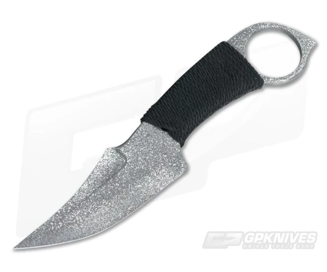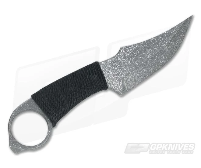 The Lobo Persian Saber Prototype from John Gray is a custom made fixed blade ring knife with wicked written all over it. The blade is an upswept “Persian” style with a robust saber grind and beefy, nearly-full-length, hollow ground swedge. The “Dark Rain” acid wash finish gives this knife a very post-apocalyptic feel. The pommel ring enhances security in the hand. This is a compact, multi-use cutting tool you can count on.Â