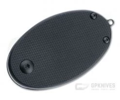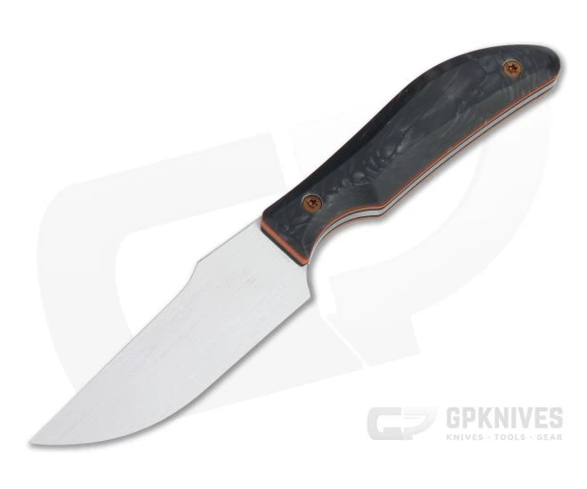 Handle: The orange peel textured titanium tang supports black snake skin pattern carbon Juma scales over contrasting orange and black liners. Juma is a thermoformable resin based material that is tough, lightweight, weather resistant and looks great. Chamfered edges, palm swell, a deep index choil and thumb ramp deliver a comfortable and secure grip, tipping the scales with a sub-2.5 ounce package weight. Includes a premium synthetic fleece lined pouch for storage.