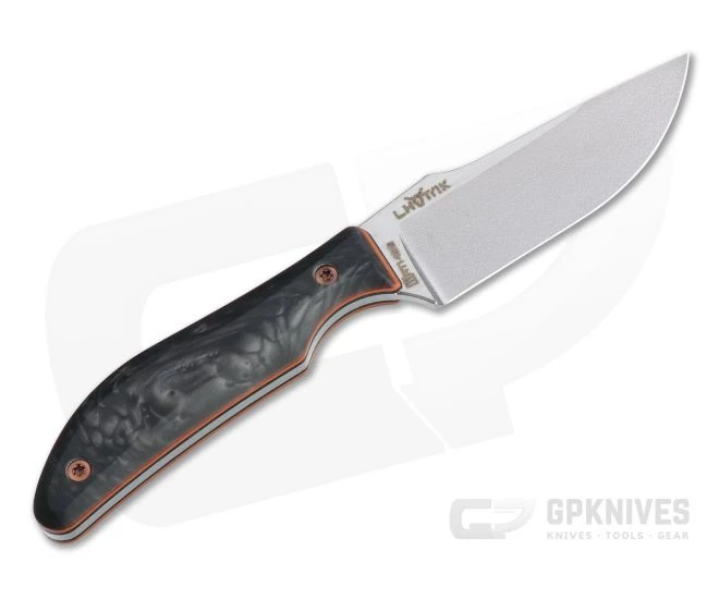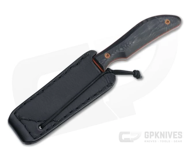 Austrian Raimund Lhotak takes his trained precision as a typographer and designer and delivers it in his precision made custom knives, hand-built without the use of a cnc. Combining simple, utilitarian designs with premium materials, his modern folding and fixed blade knives are exceptional tools for daily carry and use in any environment. This RL6 Mini Utility fixed blade comes with a right-hand chisel ground ATI 425 titanium alloy blade and black carbon snake Juma handle scales with orange and black liners, titanium hardware and leather sheath.