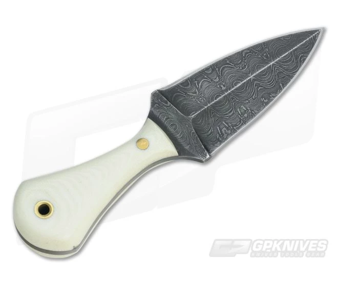 This necker is under five inches overall with full tang damascus construction. Dual edged for sharp, piercing power with pinned white g10 handle scales. Clean, tough construction this Necker from Olamic would make an excellent companion. Includes a lanyard hole.Â