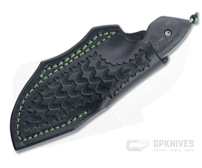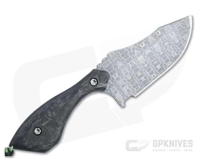 The Otha Custom Knives Klax makes a great daily carry companion or folding knife alternative to handle your regular cutting chores. Rugged and reliable for heavy use, this compact fixed blade is discreet to carry and fast to deploy. This clip point version comes with a Nichols Carbon Lizard Damascus blade and shred carbon fiber handles.