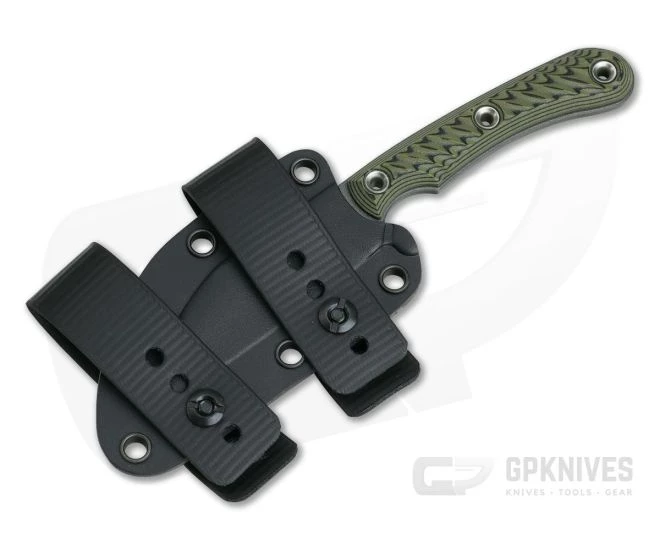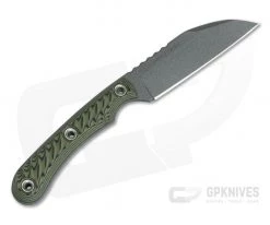 Handle:Â Layered Dirty Olive G10 scales are chamfered for comfort with milled grooves that offer a secure grip in adverse conditions. The scales are securely attached to the full tang handle with flared pins which also facilitate lanyard attachment. The handle ergonomics are enhanced by the chamfered spine being proud to the scales giving a fuller in-hand feel.