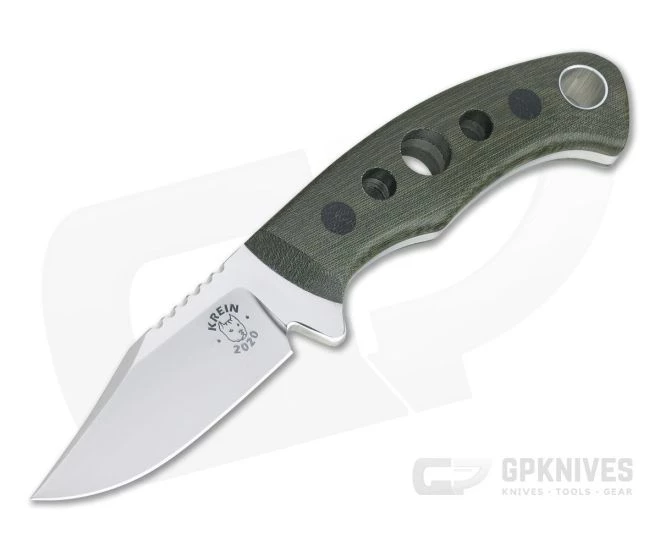 The Pocket Bowie is a custom clip point fixed blade from maker Tom Krein. A classic, Bowie-style fixed blade designed with Krein’s signature ergonomic handle and performance oriented hollow grind this clip point hunter makes a great outdoor EDC knife and cuts well above its weight class. This version comes with a satin finished Nitro-V stainless steel blade and Green Linen Micarta handle scales with speed hole milling and black Micarta pins.