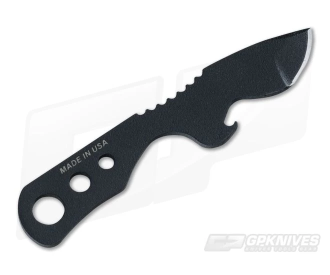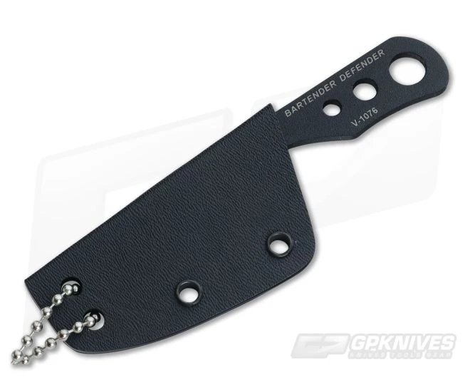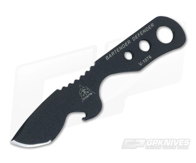 The TOPS Bartender Defender mini fixed blade knife is one solid piece of 1095 tool steel ready to party or defend at a moment’s notice. Sports a hunter point blade with a razor sharp grind and bottle opener on the bottom just before the blade. The entire knife has received a black traction coating along with an aggressively notched thumb ramp provide a solid grip. The skeletonized handle makes for a lightweight carry option. Includes a molded kydex sheath with a beaded neck chain.