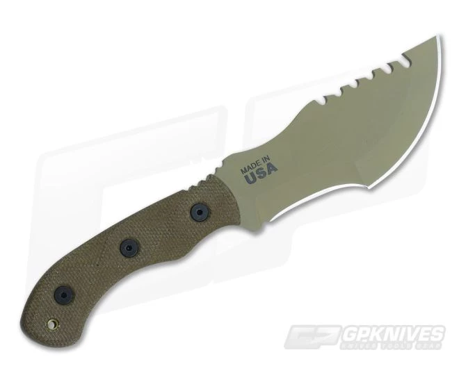 The Handle:Â Very simple, yet very effective green canvas micarta handle scales are cut the same as white liners beneath them and bolted to the full tang design. This material is comfortable and maintains its grip rain or shine. The Mini rests in the first three digits comfortably for a nice, ergonomic grip on a tool of this size. A small brass lanyard tube is inserted near the end.Â
