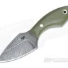 The Handle:Â This has a big choil guard with thick slabs of green canvas micarta for grip, even when wet. It’s sure to be solid in any hunting grip. The extended tang hooks downward for a reverse guard to prevent slippage during use. A large lanyard hole and red fiber liners are the finishing touches.