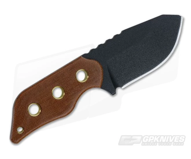 TOPS Knives Lil Roughneck is quite possibly the thickest knife TOPS has ever produced at 3/8″ thick of black traction coated 5160 spring steel awesomeness. The full tang is slightly lightened with three machined hole cutouts plus a small lanyard hole in the handle. A comfortable feel in hand with tan canvas micarta scales providing the grip. Includes a black kydex sheath with rotating spring steel clip.